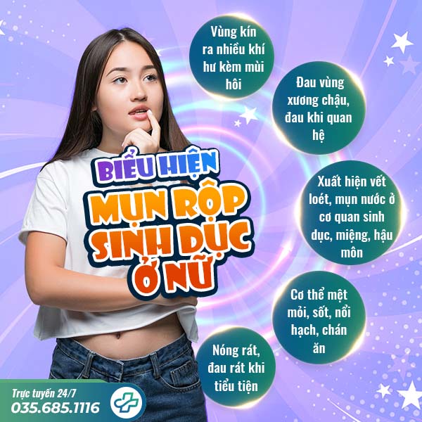 - Mụn rộp sinh dục: Mụn đỏ, mụn nước mọc sát nhau. Các nốt mụn dễ vỡ, gây ra lở loét nghiêm trọng.